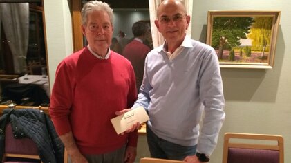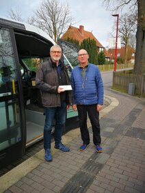 Der wiedergewählte Vorsitzende Dr. Hans-Karl Haak übergibt einen Gutschein an Rüdiger Flader und dankt damit für die geleistete Tätigkeit im Vorstand und am Volant (ugs. das Lenkrad). Peter Lerch bekam ebenfalls einen Gutschein, der ihm von Ulrich Zober am Fahrzeug überreicht wurde.